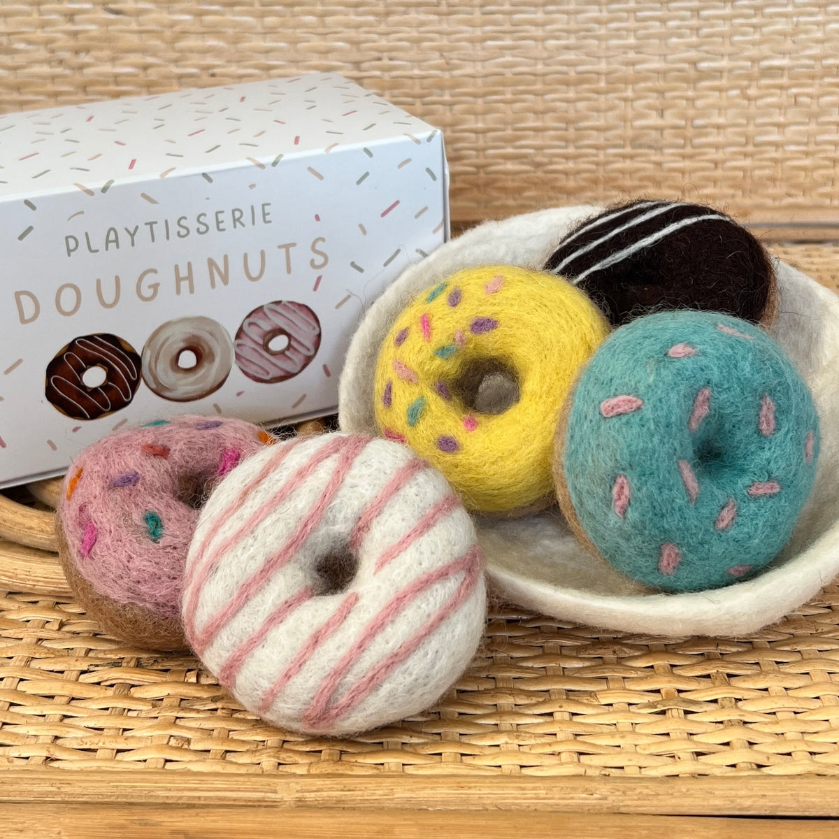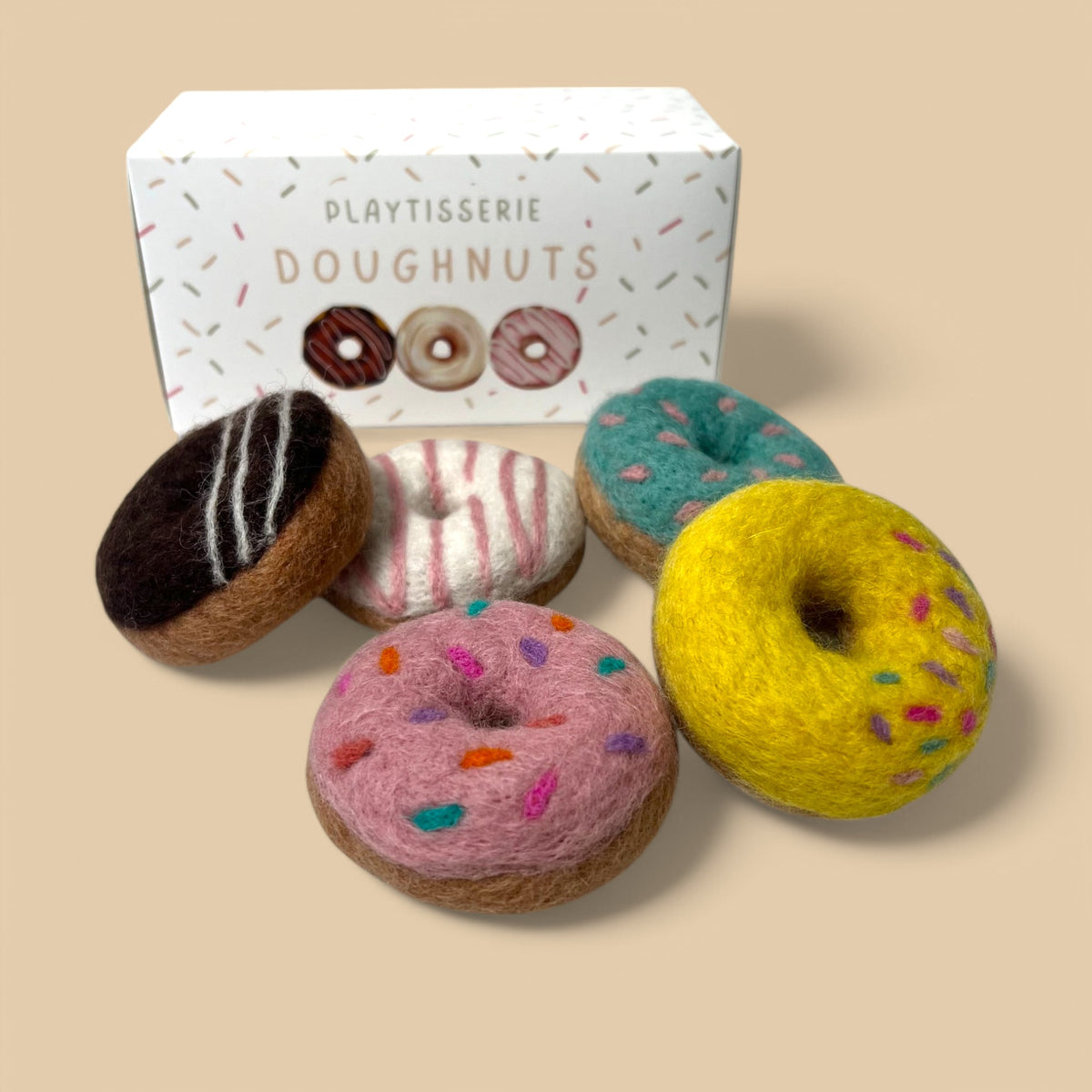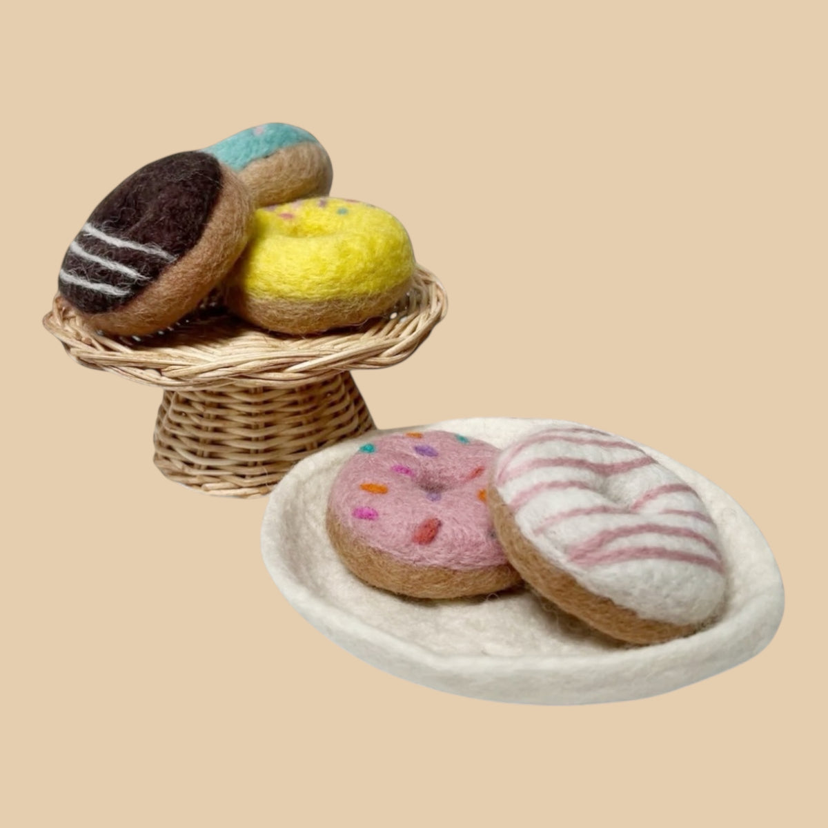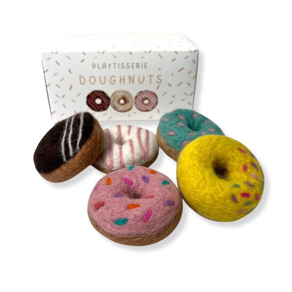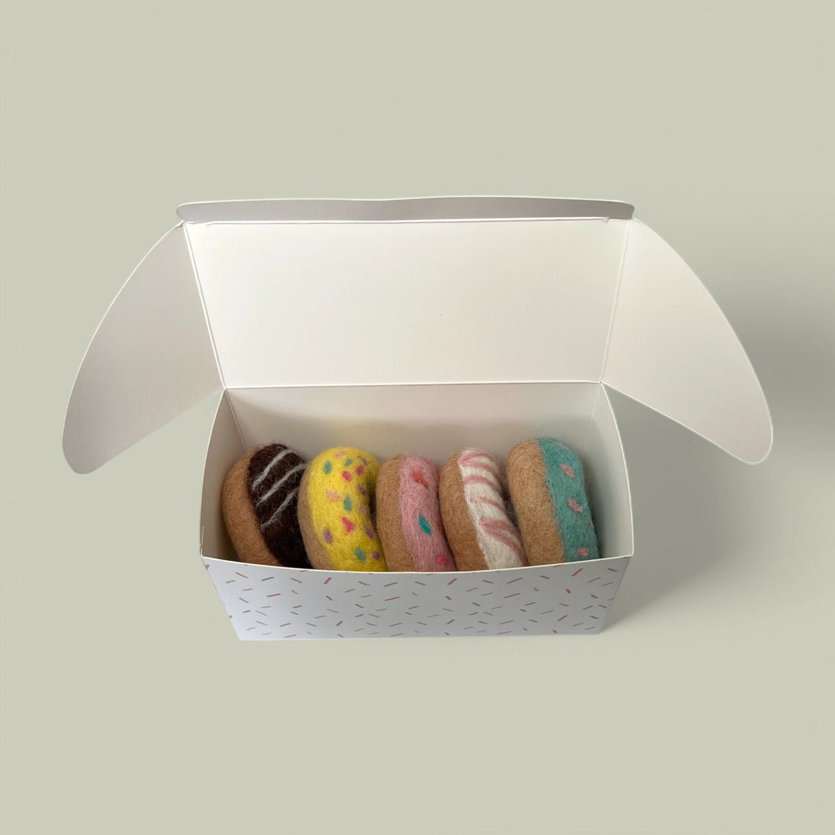 Our set of 5 handmade Doughnuts includes chocolate with white drizzle, strawberry with sprinkles, vanilla with strawberry drizzle, pineapple with sprinkles, and bubble gum with sprinkles. Packaged in an eco-friendly Playtisserie doughnut box, they are sure to add a sense of realism to your little one's shop or café.