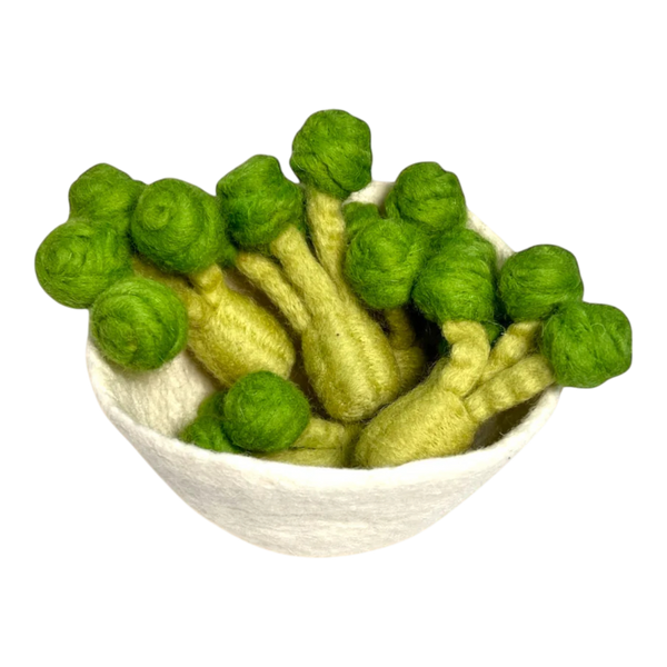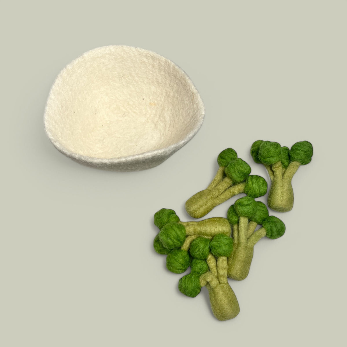 A fun way to bring greens to playtime! This set of 5 felt broccoli florets in a white bowl is a delightful addition to any play kitchen or market, inspiring little ones to make healthy choices through imaginative play.