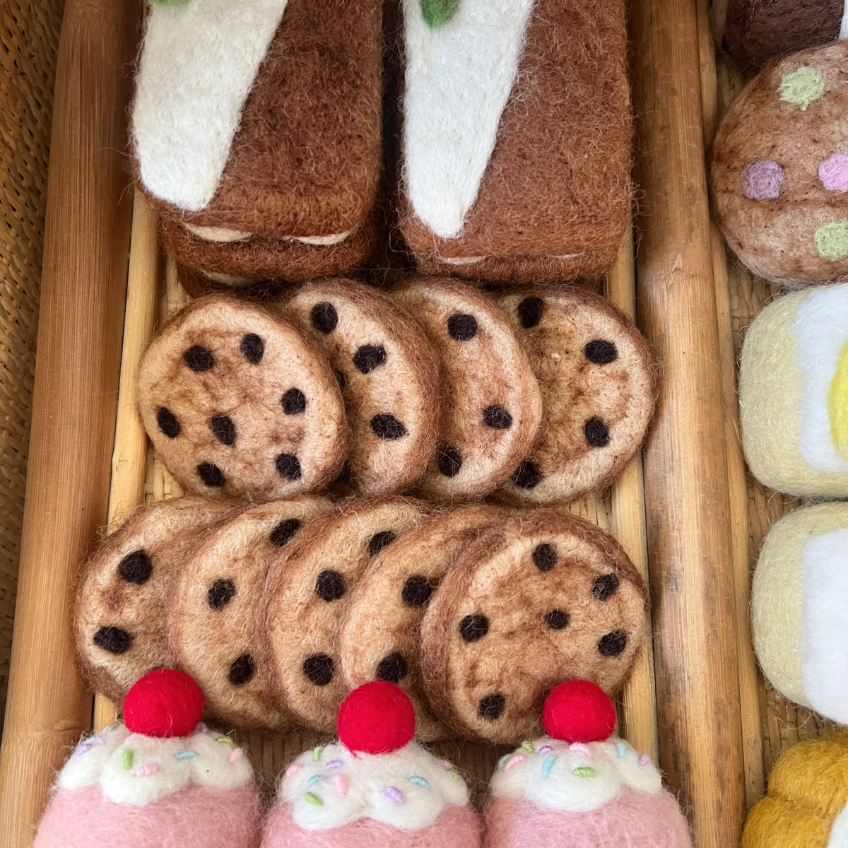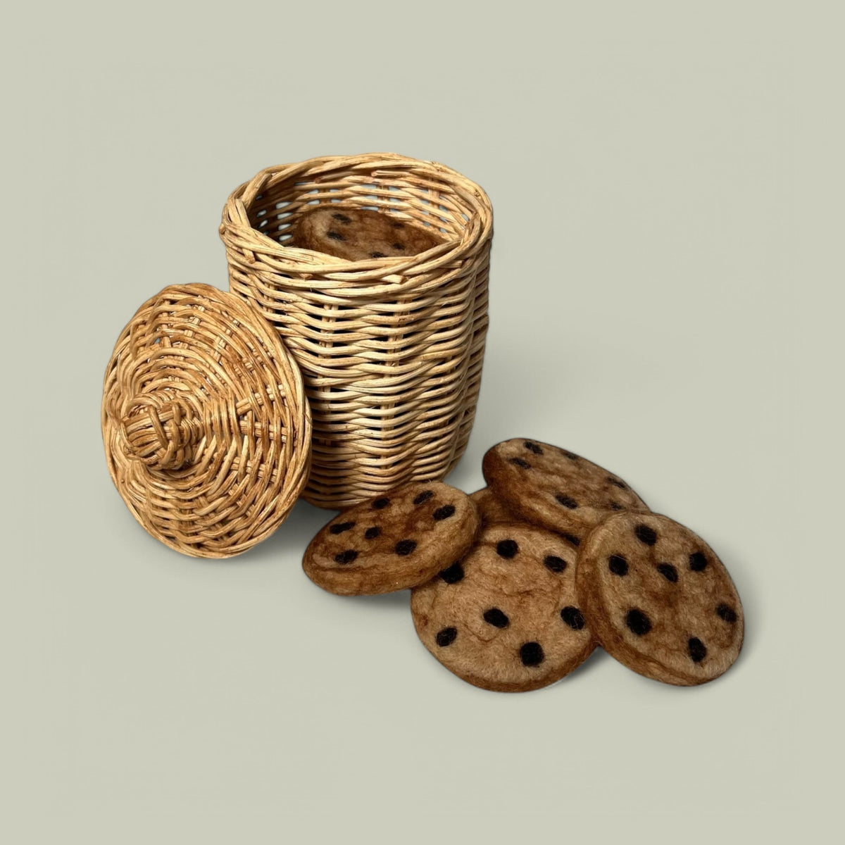 Our set of 5 Chocolate Chip Cookies is perfect for tea parties, play cafés, and baking adventures. Ethically made from soft natural wool, they’re sure to bring a sprinkle of fun to any play kitchen or shop!
