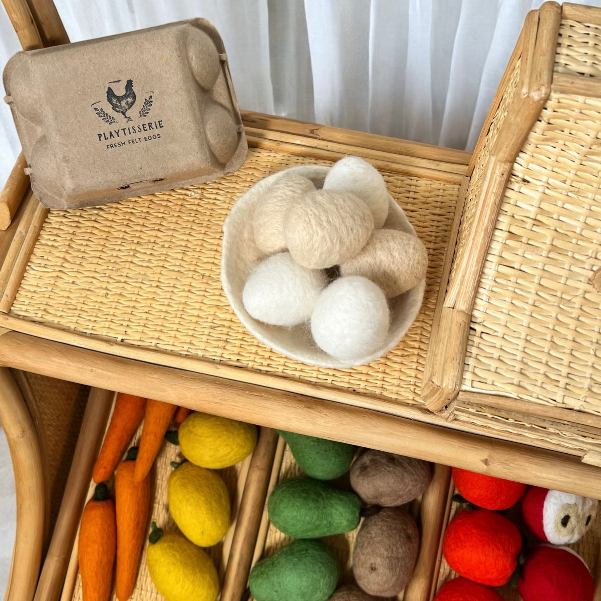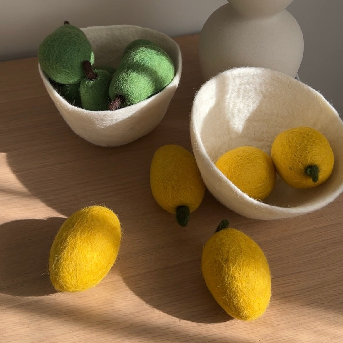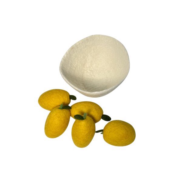 This set of 5 felt lemons in a white bowl brings a zesty touch to pretend play, making healthy choices more fun and imaginative
