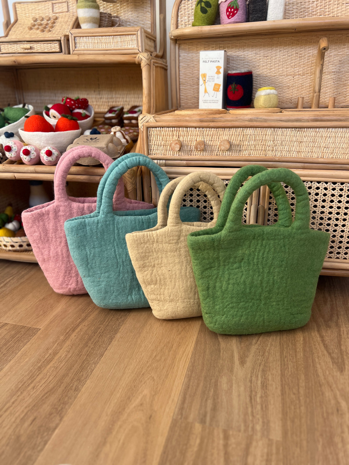 Our beautiful shopping bags are lovingly handcrafted from soft natural wool and non-toxic dyes using a wet felting technique.