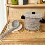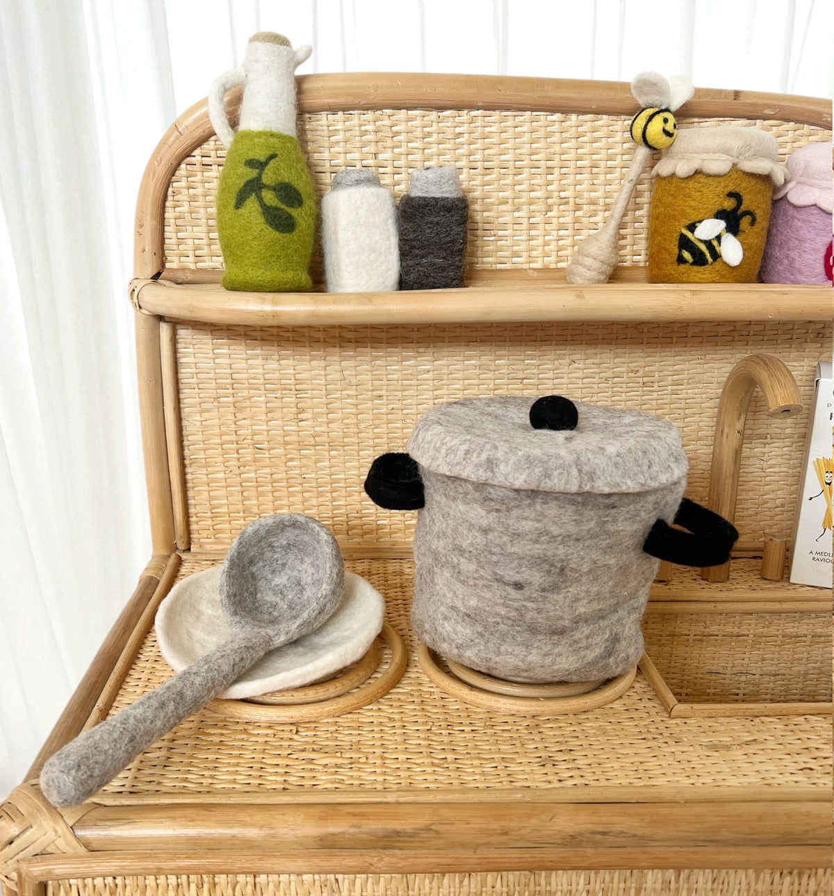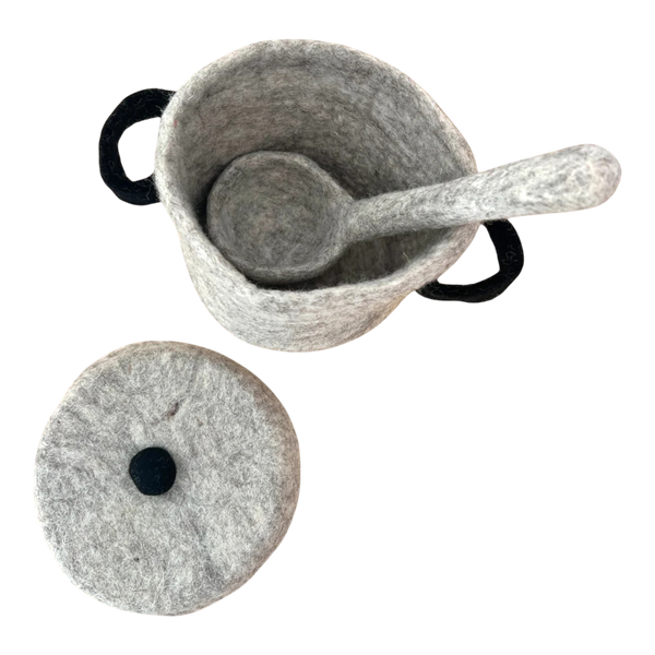 The snug-fitting removable felt lid and ladle adds delightful detail and encourages little chefs to lift, stir, and pour, making it a perfect staple for play kitchens, tea parties, play cafés, and make-believe family dinners.