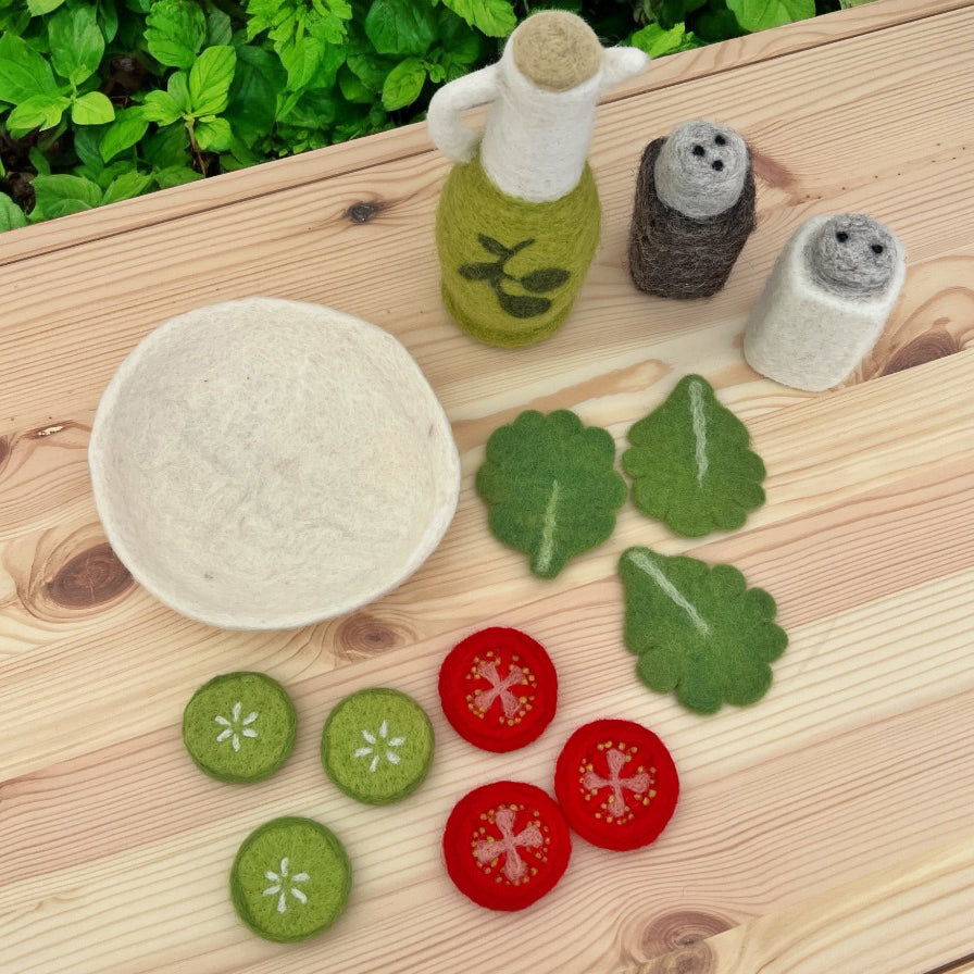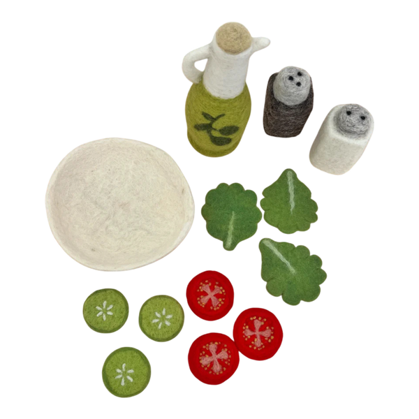 Everything a little food-lover needs to serve up a fresh, colourful salad, served on a beautiful white plate with realistic condiments.