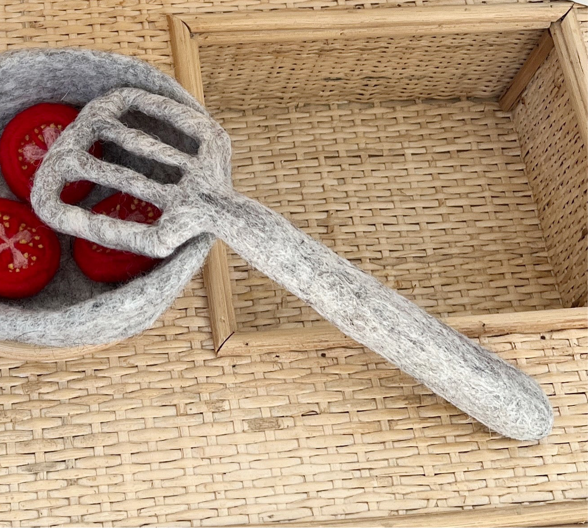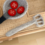 Handmade with care from soft, natural wool and coloured with non-toxic dyes, our felt spatula is the perfect accessory for little chefs. Lightweight, tactile, and safe for small hands, it adds a realistic touch to pretend play while staying soft and gentle.