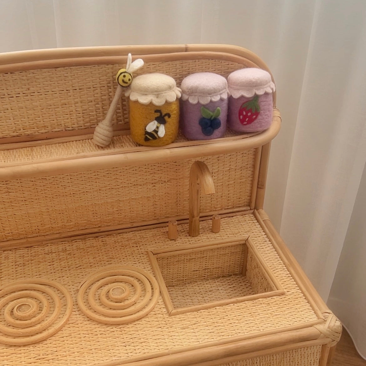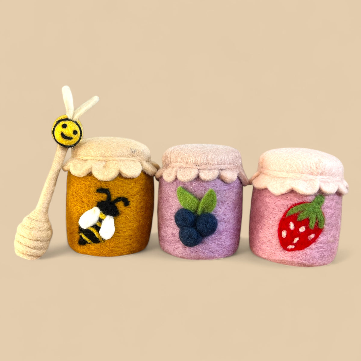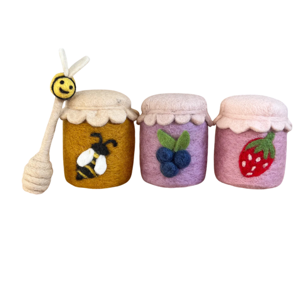 This four-piece set includes our beloved Strawberry Jam, Blueberry Jam, Honey Pot, and matching Dipper. All handcrafted from soft natural wool and non-toxic dyes using a mix of wet and needle felting techniques.