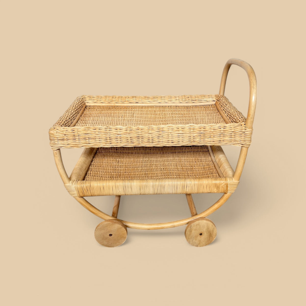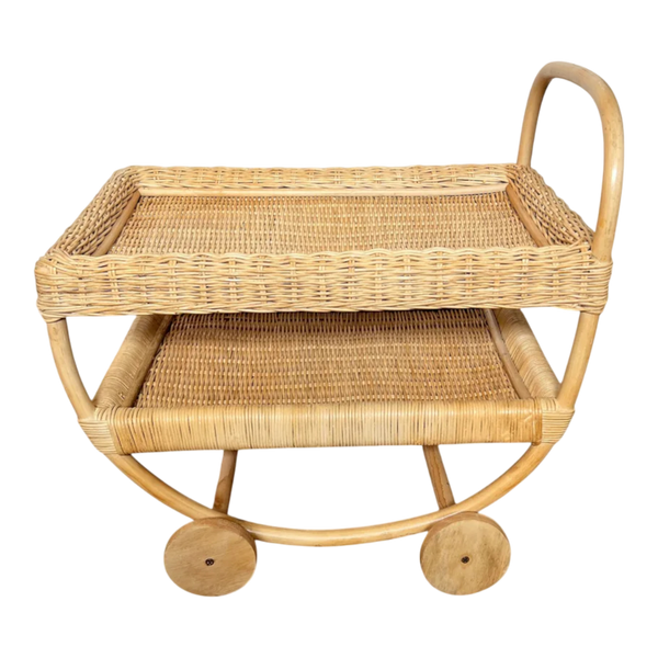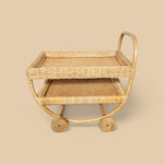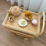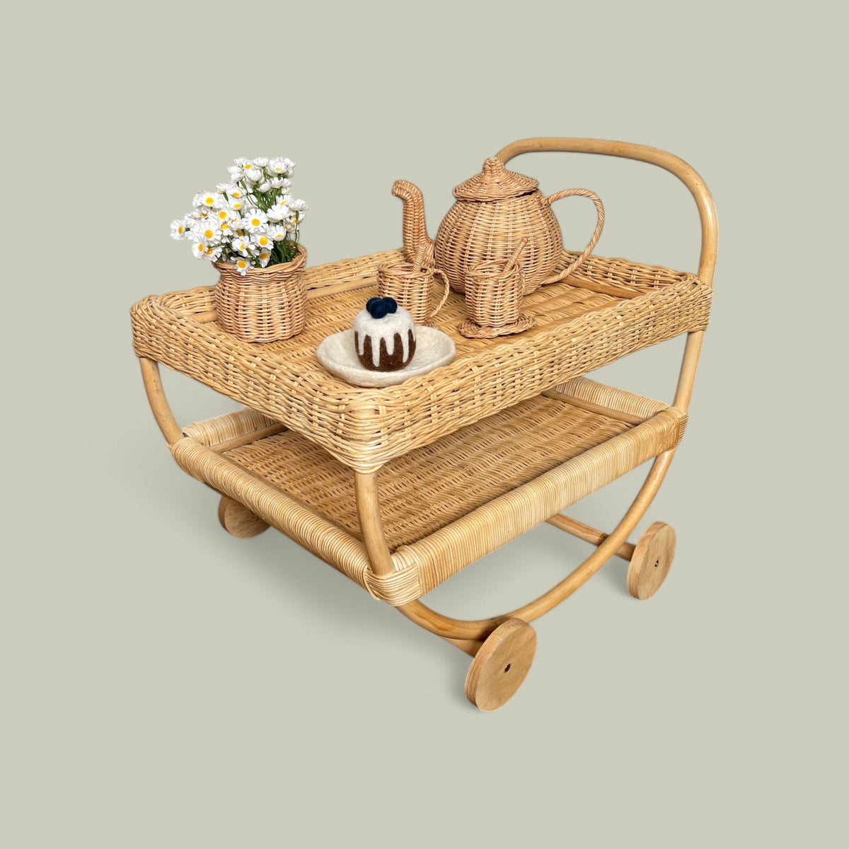 Delicately handmade by skilled artisans, our Tea & Coffee Cart is crafted from premium rattan and features elegant wicker detailing. With two spacious tiers for displaying toy tea sets and sweet treats, plus functioning wheels for easy movement, it's the perfect addition to any imaginative play setting.