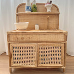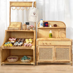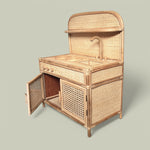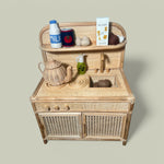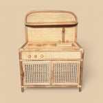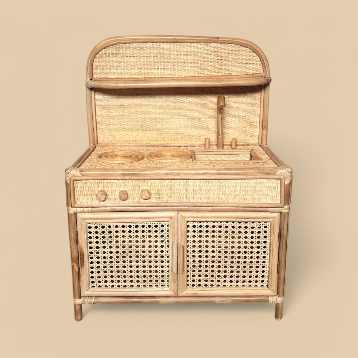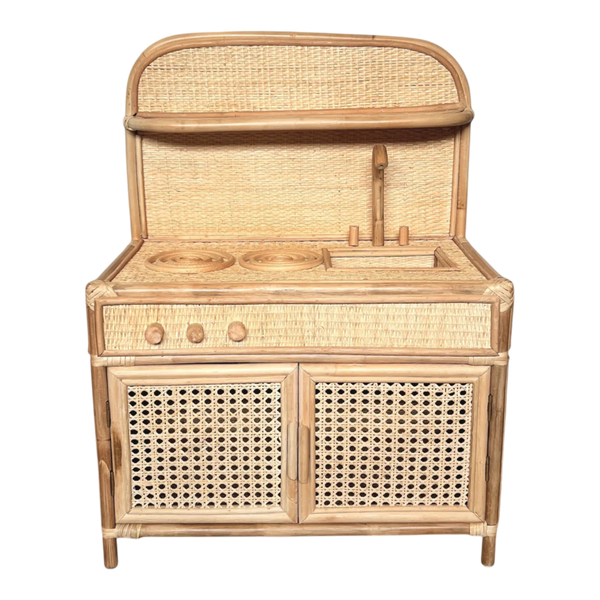 Handmade from natural rattan it features realistic stove knobs, a sink for washing up after a busy day of play, and an upper shelf and cupboards to store or display your kitchen essentials.